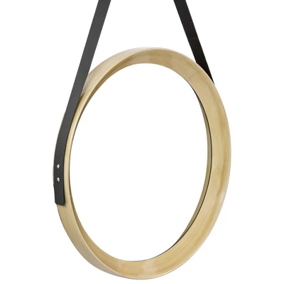 This round mirror features a beautiful brownish gold wood like finish frame that adds warmth and sophistication to any room. The frame has a subtle sheen that catches the light and draws attention to the mirror’s elegant shape. The unique hanging strap adds a modern feel. Timeless and versatile, it’s a great addition to a variety of decor styles. This mirror is sure to become a beloved piece in your home for years to come.Features:Round wood finish mirror Easy to hang from attached strapFor indoor use onlyDimensions: 20″ in diameter x 1.5″ deepHanging height: 31″ with strapMaterials: plastic/glass