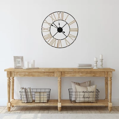 This unique clock is designed with carved, block roman numeral numbers. A great wall piece for an industrial decor design. You don’t have to worry about electric cords since it is battery-operated.Product Features:Black and brown round wall clockFeatures roman numerals in carved block designsBlack hour and minute handsMetal keyhole hook on back for hangingRequires (1) AA battery, not includedRecommended for indoor or outdoor useDimensions:24″H x 24″W x 1.5″DMaterial(s):MDF/plastic/metal