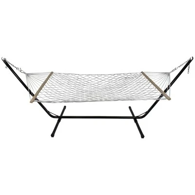 Relax in style with our portable tree hammock. A comfy addition to your outdoor space. This hammock is brown with a lattice pattern and wooden bars to attach the hammock to a stand. Perfect for hanging between trees, on your balcony or even given as a gift for that special someone this summer season!Features:Brown rope hammock with lattice pattern rope designComes with attached rope and wooden bars for easy hanging and stability1-person hammockRecommended for adults, children need to be supervisedCan be used indoor or outdoorWeight capacity: 265lbsDimensions: 78″ long x 55″ wideMaterial(s): polyester/woodNote: hammock only – stand and hanging hardware are not included