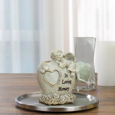 Welcome spring and summer to your patio or home decor with this adorable cherub statue. This statue features a sleeping cherub. It is accented with hearts and flowers. It has a bud vase to put your favorite flowers for a pop of color. This will make a great addition to your backyard, front yard, garden, porch, or to your indoor space.Product Features:Cherub with bud vase garden statueFeatures a peaceful angel resting upon a heart-shaped stoneThe base features detailed rosesStone is inscribed with the words “In Loving Memory” Has a bud vase for flowersHas intricate details that provide a realistic lookRecommended for indoor or outdoor useDimensions: 6.5″H x 5.50″W x 3.5″D Vase opening: 1.50″ diameterVase depth: 2.75″ deepMaterial(s): polyresin