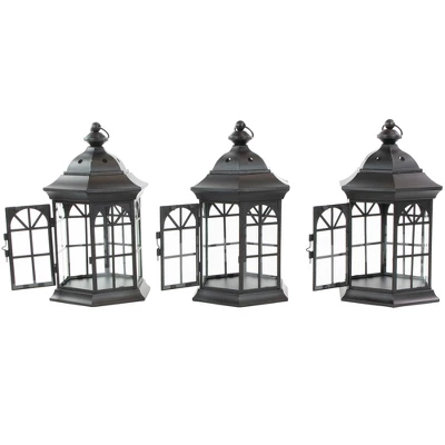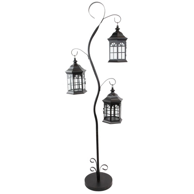 Lanterns accent any decor style from traditional to contemporary. This lantern tree is the perfect addition to entryways, porches or your patio. Place a candle inside each lantern to create a cozy atmosphere. The ring at the top allows you to hang the lantern from the scroll branches. The sleek metal and glass are a great way to add a timeless chic touch to your living space or a unique touch to holiday decor.Product Features:Distressed matte black candle lantern treeThree mission-style hanging lanternsLanterns have hinged doors for easy accessEach lantern can hold (1) candle – not includedRing at the top of the lanterns allows you to hang the lanterns from treeSwirled tree trunk with scrolled branchesEasy assembly is requiredRecommended for indoor use only – if using outdoors place in a covered areaDimensions: 71.50″H x 18.25″W x 8″DLanterns: 13.5″ high by 7″ diameterBase: 11.75″ diameterMaterial(s): metal/glass