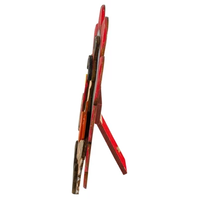 Rustic wooden turkey decoration comes with red, gray, and green tail feathers and is holding a pumpkin. This dapper turkey is wearing a black top hat. The easel back allows the turkey to stand freely on a tabletop. Perfect as a mantel decoration or for placing on an end table. Features:Turkey Thanksgiving tabletop decorRustic wood finishWearing a black top hat with red ribbon and gold buckle accentEasel back provides support for turkeyFor indoor use onlyDimensions: 9.5″H x 9.75″W x 5.5″DMaterials: wood