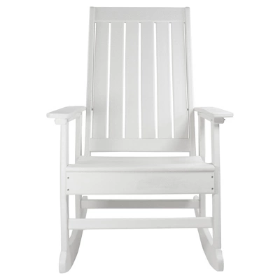 Rocking chairs add a timeless look and provide just the right amount of relaxation to your outdoor space. They are a classic staple for front porches or back patios. Our all-weather rockers are constructed from recycled, eco-friendly, high-density polyethylene lumber making them extremely durable but with very low maintenance. Unlike traditional wooden rocking chairs, they will not splinter, crack, chip, peel or rot, and they are resistant to substances such as oils or salt spray. Pairs well with any of our matching side tables. Product features:Color: whiteMade from recycled HDPE plastic designed to look like woodNo staining, painting or sealing is needed Will not splinter, crack, chip or peel 100% weather-resistant material withstands the sun, wind, rain, and salt sprayOccasional inspection and cleaning is recommended to keep your furniture looking newGently sloped runners provide a smooth rocking motion Contoured seat for a comfortable rocking experience Some assembly is required – tools are neededWeight capacity: 300lbsOverall dimensions: 42″H x 27.25″W x 33.25″DSeat: 18.25″H x 21.5″W x 17.5″DBack: 30.5″H x 20″W Armrest: 26″HMaterial(s): HDPE (high-density polyethylene)