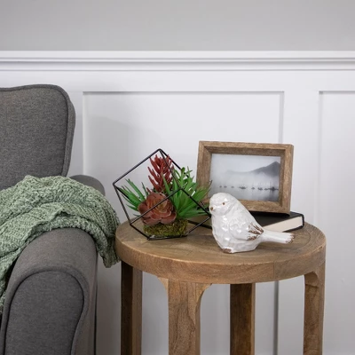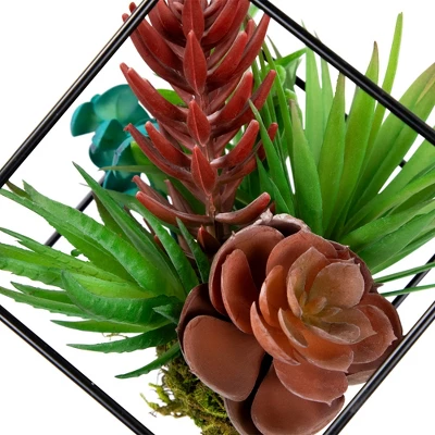 This artificial succulent arrangement displayed inside an offset metal wire frame combines a modern botanical accent with industrial charm. Designed with a curated mix of faux succulents in varying shades, the arrangement creates realistic texture and depth without the upkeep of live plants. The lifelike leaves are set against a backdrop of natural-looking moss, all nestled within a sleek metal frame that features a geometric design for added visual interest. The frame creates a floating effect that makes the arrangement stand out when placed on a shelf or tabletop. The structure and balanced design pair well with minimalist, urban, or bohemian interiors. Durable materials ensure long-lasting color and shape, making it suitable for year-round display in both home and office settings. The wire frame allows light to pass through, highlighting the natural tones and textures of the artificial succulents from every angle. Ideal for living rooms, hallways, or creative workspaces, the arrangement serves as a low-maintenance solution that provides a nature-inspired aesthetic with a contemporary twist. Its compact footprint makes it versatile for small spaces without sacrificing style.Product Features:Realistic plants with faux moss Black metal abstract frameRecommended for indoor decorativeDimensions: 7″H x 6.75″W x 4.25″D Material(s): plastic/metal