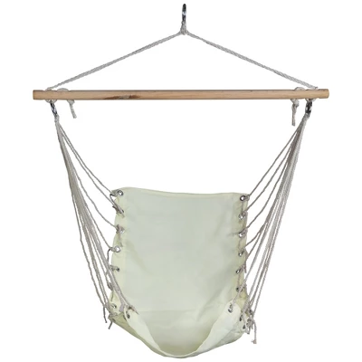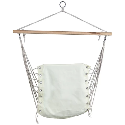 This hammock chair would be a breezy addition to your outdoor patio space. Relax and unwind in the comfort of your backyard. Just perfect for reading a book, taking a nap, sunbathing, or viewing the stars. Simply hang between trees, on your deck, or in a hammock stand and take a load off. Product Features:Solid hammock chairColor: creamComes with ropes and a wooden bar with a metal loop for easy hanging and stabilityFor adults only, adult supervision when in use by childrenHangs best on a metal frame (not included)Recommended for indoor or outdoor useDoes not come with paddingDimensions: Overall: 33″ long x 37.25″ wideSeat: 33″ long x 18″ wide Material(s): polyester/wood/metalNote: hammock only – stand and hanging hardware are not included