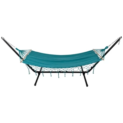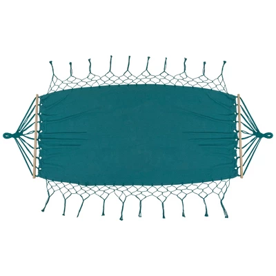 Unwind beneath the summer sky in this blissful hammock! The serene teal design with a netted fringe border creates a stylish and inviting spot to relax. Imagine the gentle breeze swaying you softly as you curl up with a captivating book, drift off to a peaceful nap, soak up the warm sun, or gaze at the star-studded sky. It easily hangs between trees, on your deck, or with a hammock stand. Escape the troubles of daily life and find your summer sanctuary!Product Features:Solid hammock bedColor: teal greenComes with braided rope loops and wooden bars for easy hanging and stabilityFor adults only, adult supervision when in use by childrenHangs best on a metal frame (not included)Recommended for indoor or outdoor useDoes not come with paddingOverall dimensions: 100″ long x 41″ wide Bed: 78″ long x 37.5″ wide Material(s): polycotton/woodNote: hammock only – stand and hanging hardware are not included