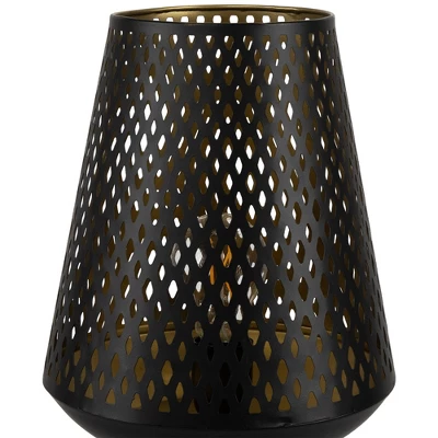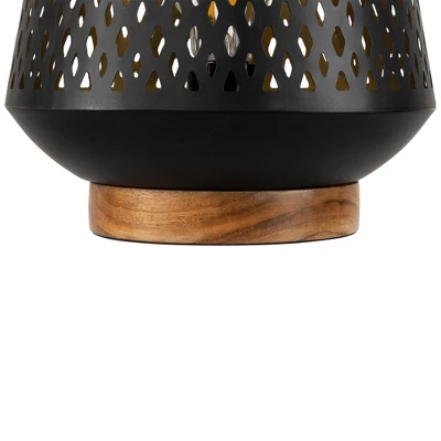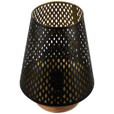 Discover the perfect blend of modern elegance and rustic charm with this iron table lamp. Featuring a laser-cut diamond pattern, this lamp casts intricate shadows that add a touch of sophistication to any space. The black and gold finish enhances its contemporary appeal, while the sturdy wood base brings warmth and stability. Ideal for living rooms, bedrooms, or offices, this table lamp is a stylish and functional addition to your decor.Product Features:Base: E26Lamp uses (1) 60 watt bulbs – not included2-way button switchWire color: blackCord length: 7.5′ UL listed for indoor use 120 volts, 60 hertz, 7 wattsDimensions: 11″H x 9”W x 9”DMaterial(s): iron/wood