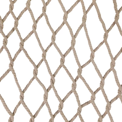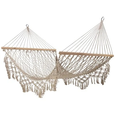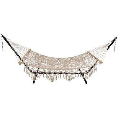 Relax in style with our portable tree hammock. A comfy addition to your outdoor space. Perfect for hanging between trees, on your balcony or in a hammock stand. Product Features:Lattice macrame rope hammockColor: creamHammock features a lattice style white rope weaveComes with tassels on both sides of the hammockFeatures white rope and wooden bars attached for easy hanging and stabilityFor adults only, adult supervision when in use by childrenRecommended for indoor or outdoor useHangs best on a metal frame (not included)Weight capacity: 400 lbsDimensions: 74″ long x 59″ wide Material(s): cotton/woodNote: hammock only – stand and hanging hardware are not included