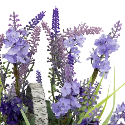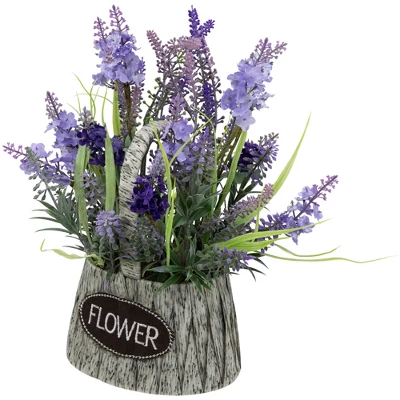 Brighten up your kitchens and dining areas with this artificial Lavender basket. Long green leaves are surrounded by tall sprigs of Lavender and purple flowers. Housed in a decorative, woven textured basket with handles, it reads “Flower” stitched on a patch. It will provide a charming touch anywhere it is displayed. Just perfect for tabletops and office desks. Pair with our matching wreath for a perfect set.Product Features:Artificial Lavender plant in basketRealistic purple flowers with green leavesBasket reads “Flower” and has a handleRequires no maintenance, watering, or sunlightItem will need to be re-shaped when removed from the boxCare instructions: wipe clean with a soft dry clothFor indoor use onlyDimensions: 12″ highMaterial(s): plastic