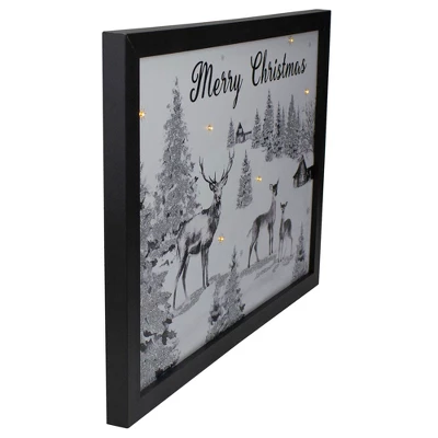 This gorgeous canvas wall art would be the perfect addition to your home for the holiday season. It depicts a beautiful black and white framed winter scene with trees, reindeer and cottages. Place some batteries in the back and watch it come to life. Perfect to place on any wall in your home. Product Features:Lighted holiday wall decor Features reindeer and holiday trees Sign reads “Merry holiday”Requires (2) “AA” batteries – not included Features an on/off switch on the sideHang on your wall with the attached hanging hardware on the backRecommended for indoor use only Dimensions: 11.75″H x 15.75″W x 1″DMaterial(s): canvas