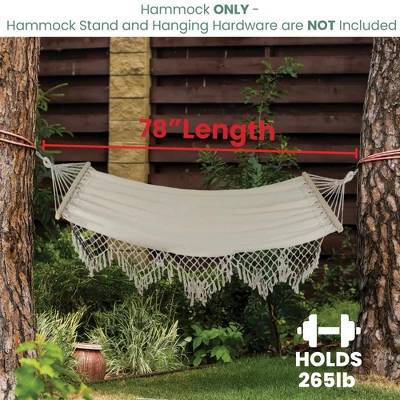 Relax in style with our portable tree hammock. A comfy addition to your outdoor space. Perfect for hanging between trees, on your balcony or in a hammock stand. Product FeaturesBeige colored macrame hammockComes with tassels on both sides of the hammockFeatures white rope and wooden bars attached for easy hanging and stabilityFor adults only, children must be supervisedWeight capacity: 265lbsDimensions: 78″ long x 47″ wideMaterial(s): poly cottonNote: hammock only – stand and hanging hardware are not included