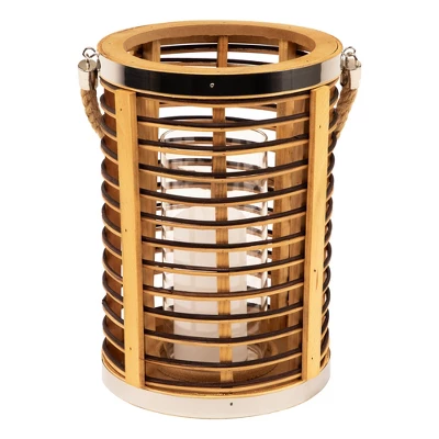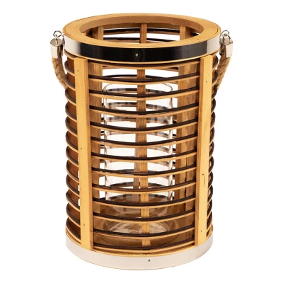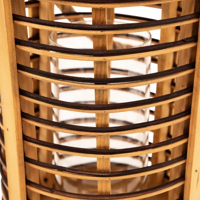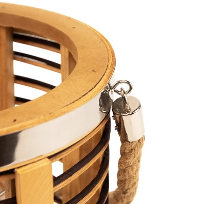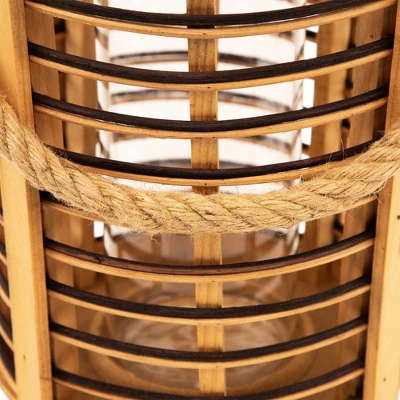 Add warmth and texture with this 11.5″ rattan glass candle lantern. Designed with open-air sides and horizontal stripes of natural and dark-stained rattan, it brings a relaxed, coastal feel to any space. Metallic accents add a subtle shine, while the clear hurricane glass inside protects your candle flame. Sized to hold a pillar candle up to 3″ in diameter, and finished with a sturdy jute rope handle for easy carrying or hanging indoors or out.Product Features:Natural and dark stained rattan Jute rope handle for easy hanging Fits a pillar candle up to 3″ in diameter (not included)Recommended for indoor or outdoor covered useDimensions: Overall: 11.5″ high x 8″ diameterGlass only: 8″ high x 3.5″ diameter Jute handle: 7.75″ high x .5″ wide Material(s): rattan/glass/metal/jute