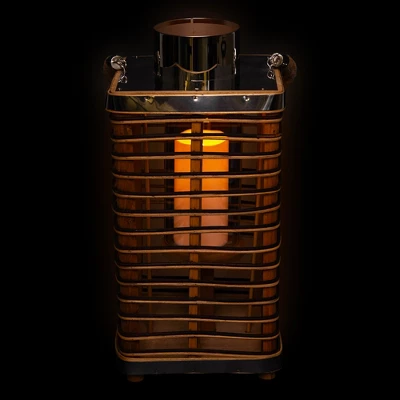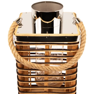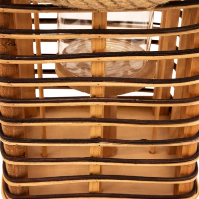 Bring warmth and texture to your space with this 15.5″ rattan and glass candle lantern. The open-air design showcases horizontal bands of natural and dark-stained rattan, paired with metallic accents for a subtle contrast. A clear hurricane glass inside holds a pillar candle up to 3.25″ in diameter, offering soft, steady light. The rectangular shape with rounded corners and a sturdy jute rope handle make it easy to carry or hang wherever you need a cozy glow.Product Features:Natural and dark stained rattan Jute rope handle for easy hanging Fits a pillar candle up to 3.25″ in diameter (not included)Recommended for indoor or outdoor covered useDimensions: Overall: 15.5″H x 7.25″W x 7.25″DGlass only: 7.75″ high x 3.5″ diameter Jute handle: 9″ high x .5″ wide Material(s): rattan/glass/metal/jute