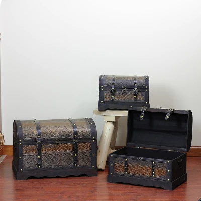 This set of 3 decorative boxes is a creative and stylish way to add storage space to any room of your home Each box features an antique look with slightly distressed wood, faux snakeskin and leather straps and antique gold metal accents Attached metal latch and snaps keep the boxes securely closed Metal carry handles on the sides make these boxes easy to move Recommended for indoor use only Dimensions: Small: 9.75″H x 15″W x 9.5″D Medium: 11.75″H x 19″W x 11.75″D Large: 15.5″H x 22.5″W x 14.25″D Material(s): MDF (medium density fiberboard)/polyurethane/vinyl/metal