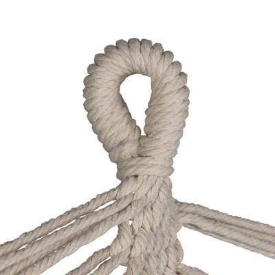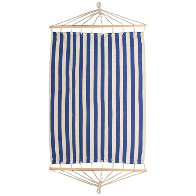 Create unforgettable summer moments with this double hammock! Curl up under the sun or stars with a loved one in this spacious design featuring breezy blue and cream stripes and a stylish macrame touch. Built-in pillows provide extra comfort as you lose yourself in a captivating book, drift off for a relaxing nap, or simply enjoy the gentle sway. Easily hangs between trees, on your deck, or with a hammock stand. Transform your backyard into a summer sanctuary and unwind together!Product Features:Striped quilted hammock Color: blue and creamComes with braided rope loops and wooden bars for easy hanging and stabilityFor adults only, adult supervision when in use by childrenHangs best on a metal frame (not included)Recommended for indoor or outdoor useDoes not come with paddingDimensions: Overall dimensions: 108″ long x 56″ wideBed: 77″ long x 55″ wideMaterial(s): polycotton/polyester/wood/metalNote: hammock only – stand and hanging hardware are not included