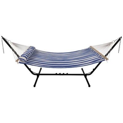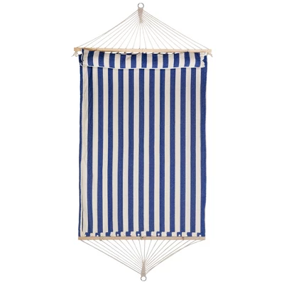 Relax with a loved one under the sun and stars in this double-seating hammock. Wide blue and cream stripes with a macrame rope design will compliment your outdoor decor. Read your favorite book or enjoy a well-needed nap, while laying your head on its built-in pillow. Metal hooks on each end to easily hang between trees, on your deck, or with a hammock stand. Sway your worries away in your own summer serenity! Product Features:Striped quilted hammock Color: blue and creamMetal loops suspended from rope and wooden bars for easy hanging and stabilityFor adults only, adult supervision when in use by childrenHangs best on a metal frame (not included)Recommended for indoor or outdoor useDoes not come with paddingOverall dimensions: 108″ long x 55″ wideBed: 73″L x 52″W x 4″DMaterial(s): polycotton/polyester/wood/metalNote: hammock only – stand and hanging hardware are not included