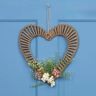 Show your love for Spring with this floral heart hanging decoration. A neutral tone, faux rattan is tightly woven around a metal-shaped heart. The base is accented with petite flowers and green leaves for a refreshing burst of color. It will add a loving touch of nature and create a vibrant ambiance for your home or office.Product Features:Heart-shaped Spring decorationDesigned with pink and white flowersMetal base wrapped with faux rattanJute rope attached for hangingNo assembly required – wreath comes in 1 pieceRecommended for indoor use or covered outdoor useDimensions: 12″H x 11.75″W x .5″DMaterial(s): metal/plastic/polyester